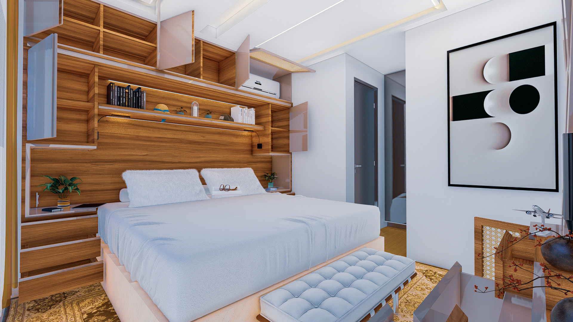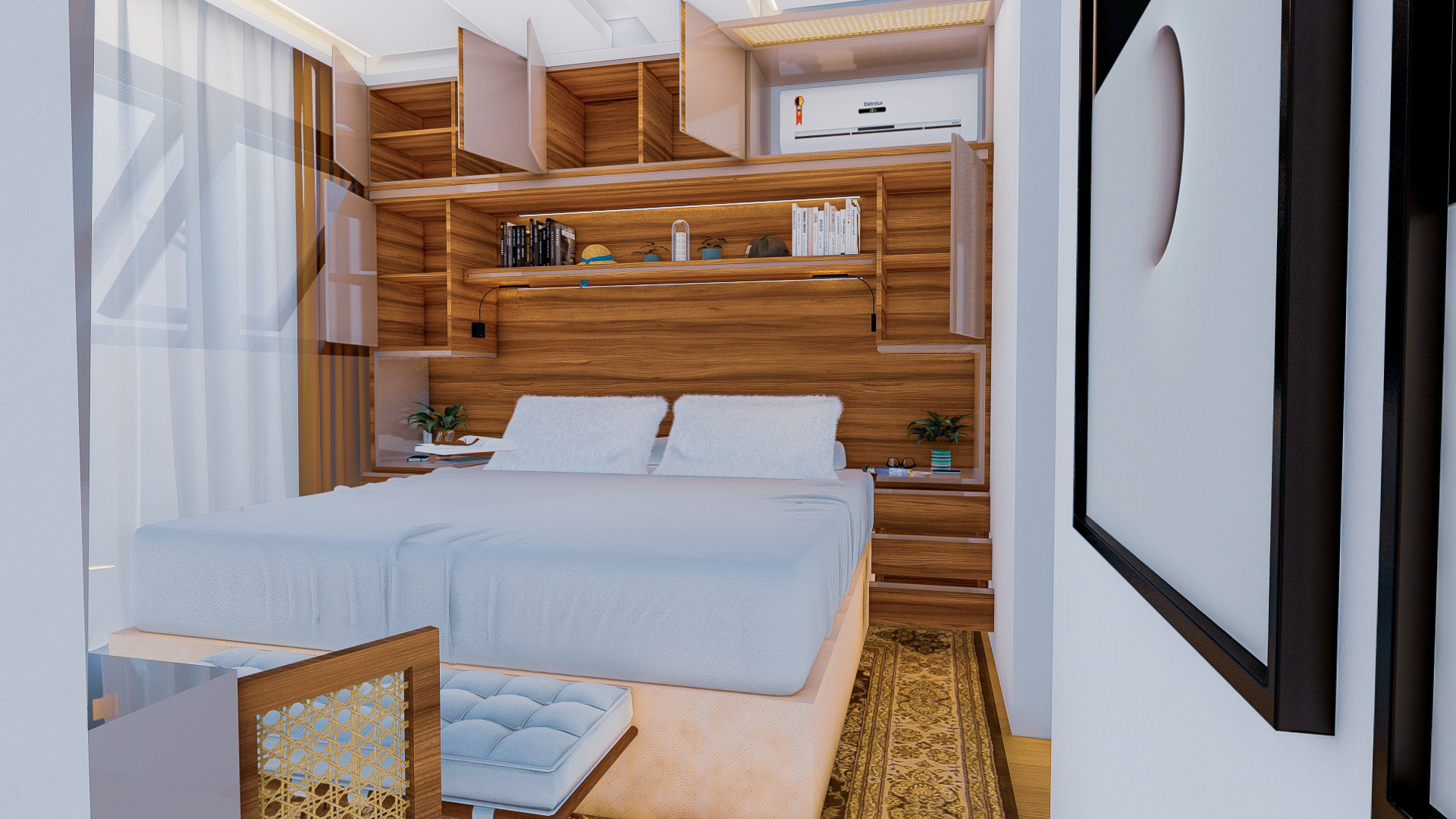 Reforma da parte superior de um apartamento duplex localizado no Lago Norte, no qual já existia uma suíte e um escritório e foi adicionado um quarto com móveis planejados e um depósito suspenso aproveitando o vão existente acima da escada. O projeto foi pensado de forma a aproveitar a ventilação e iluminação natural, trazendo mais funcionalidade e conforto. Alguns móveis existentes foram aproveitados a pedido dos clientes, a partir dai combinamos cores neutras com brilho deixando o espaço mais harmônico e com design moderno para atender as necessidades dos usuários.